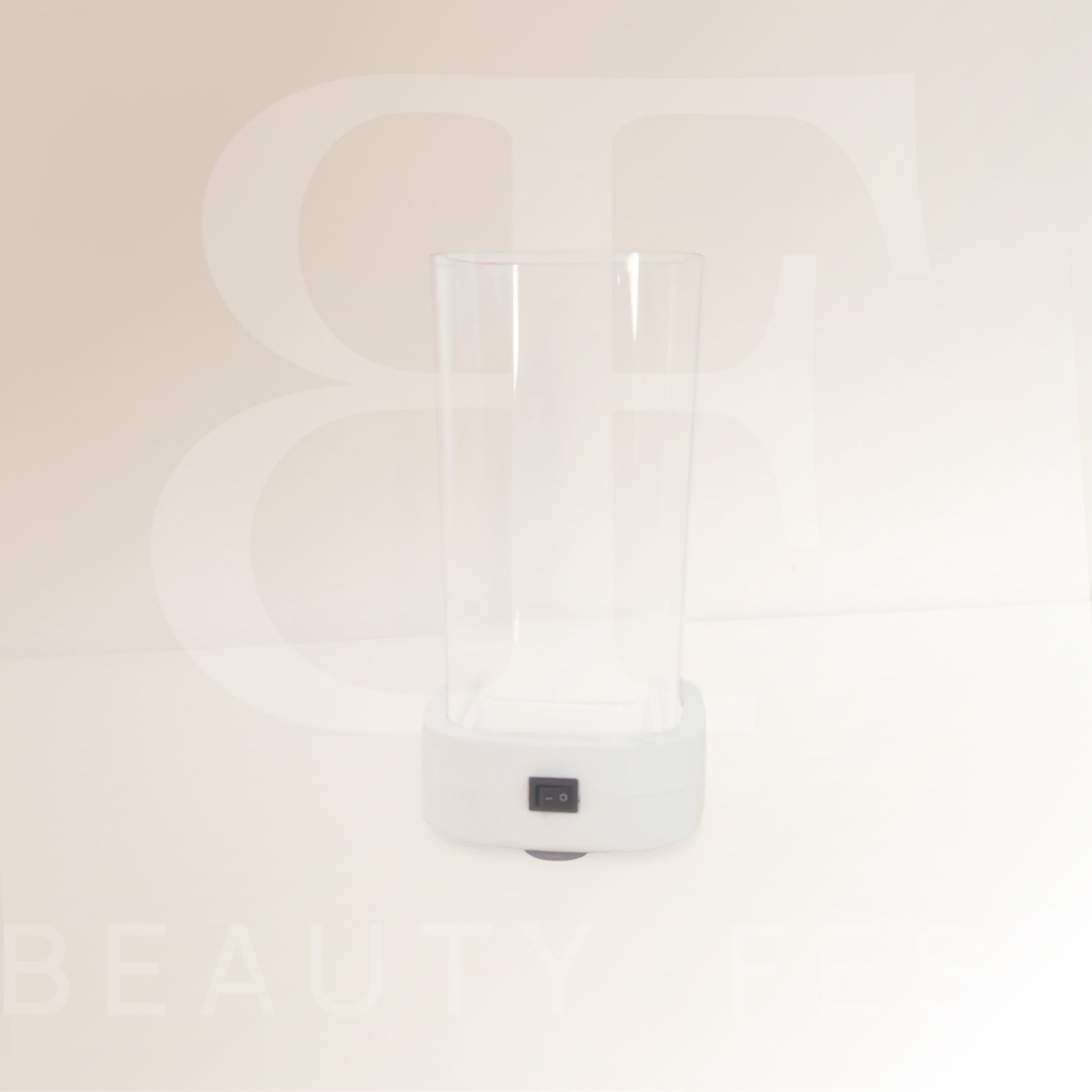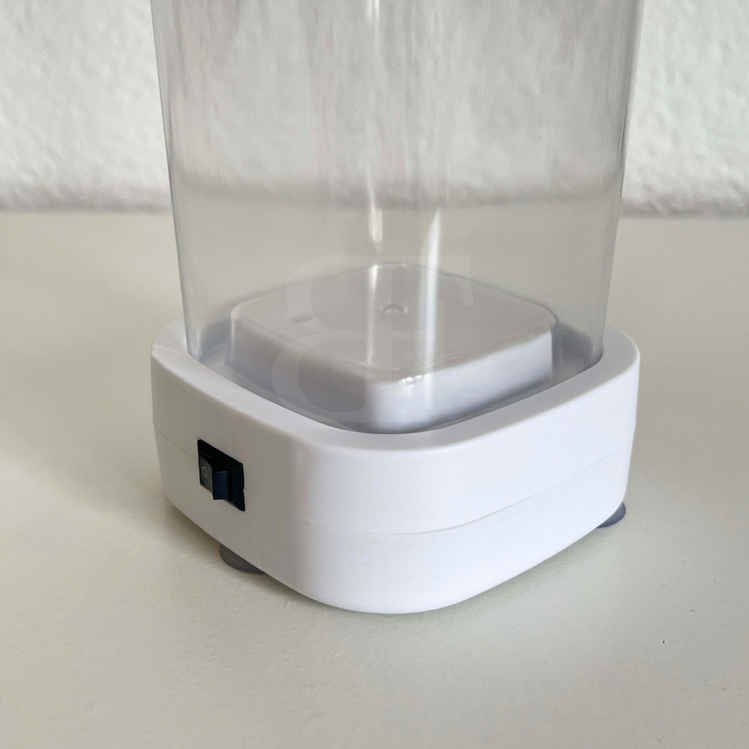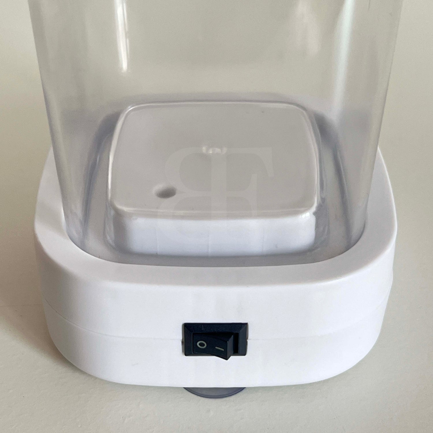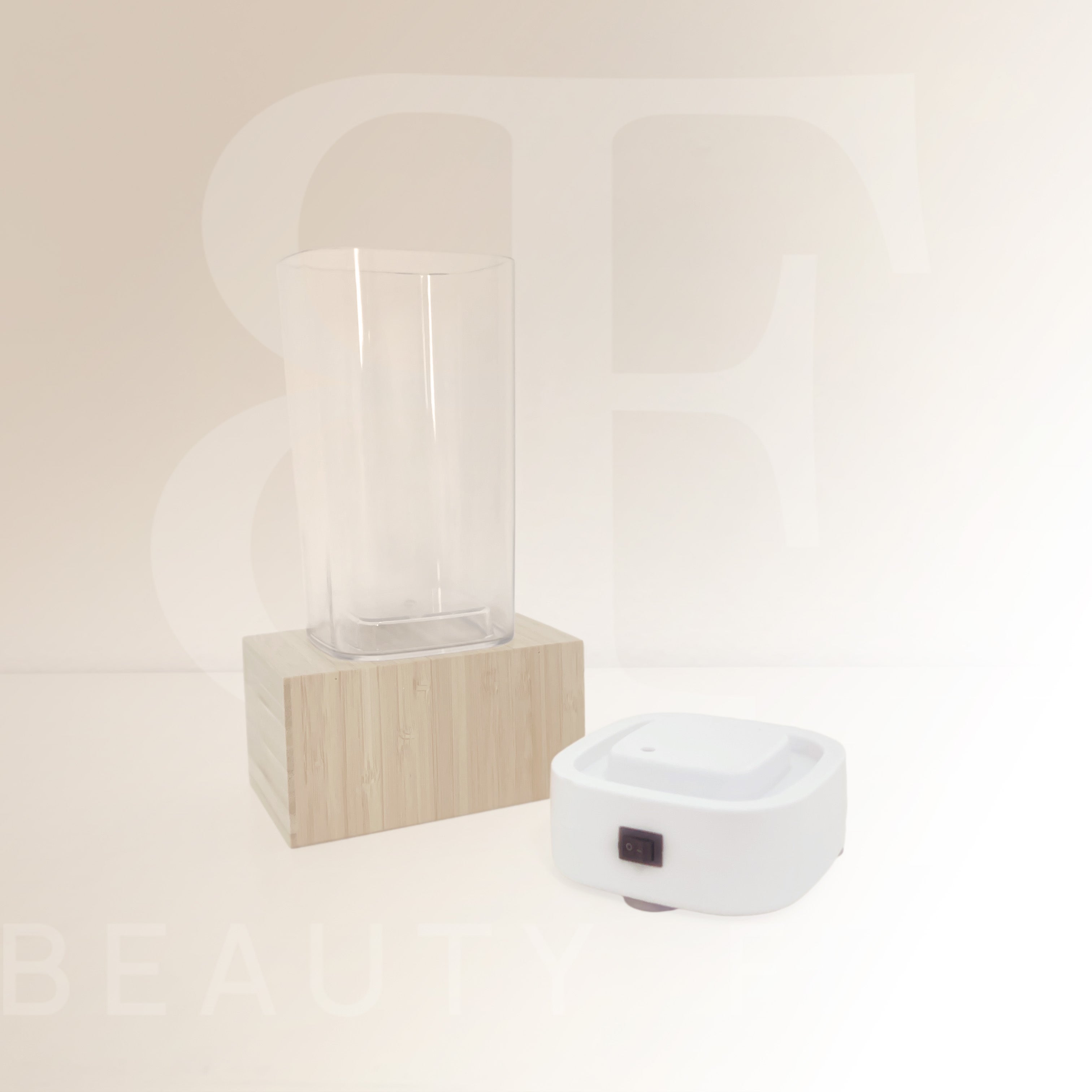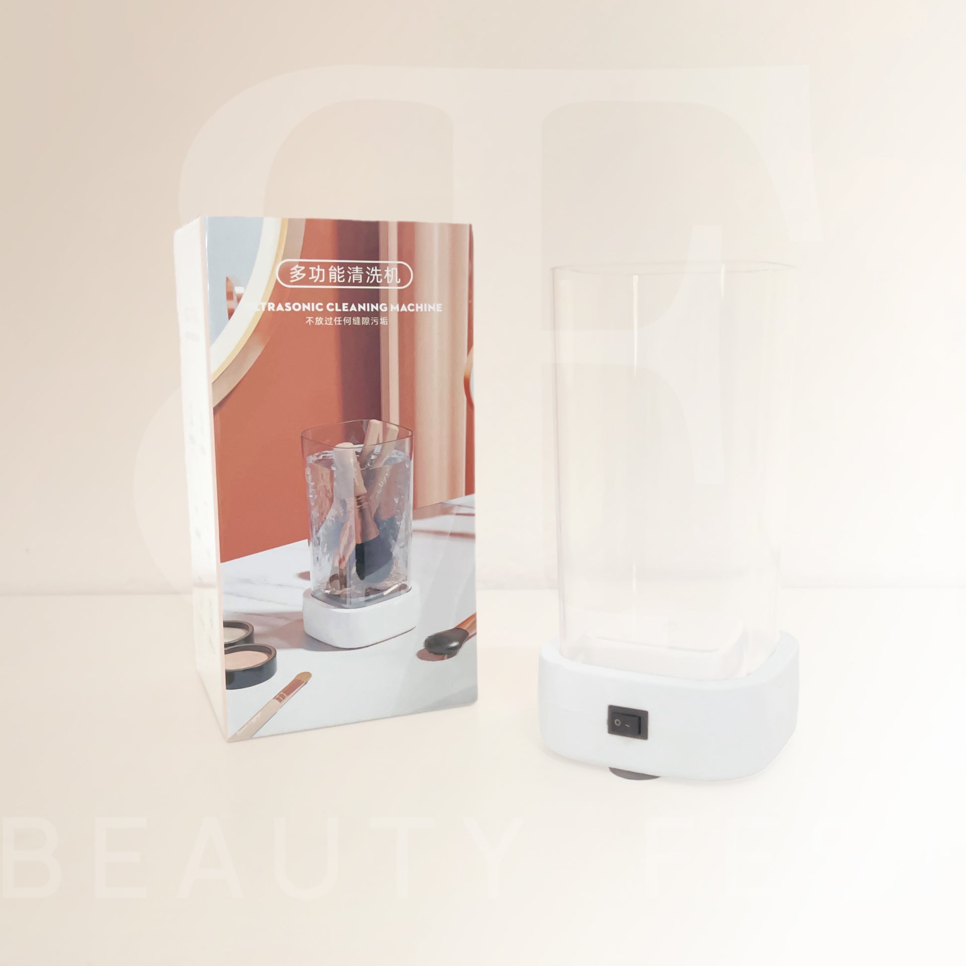 Limpiador de maquillaje por ultrasonidos con base blanca y depósito de 0,35 L. Ideal para limpiar brochas, esponjas y accesorios de forma rápida y sencilla.